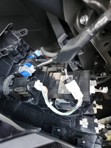 内装を分解して、車両側のハーネスに専用カプラーを介して接続。純正機能を損なわないよう、確実に絶縁処理を行いながら安全第一で配線作業を進めました。