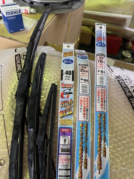 フロント左右とリアのワイパーゴムの摩耗が進んでおり、拭き取り不良や雨天時の視界不良が見受けられました。