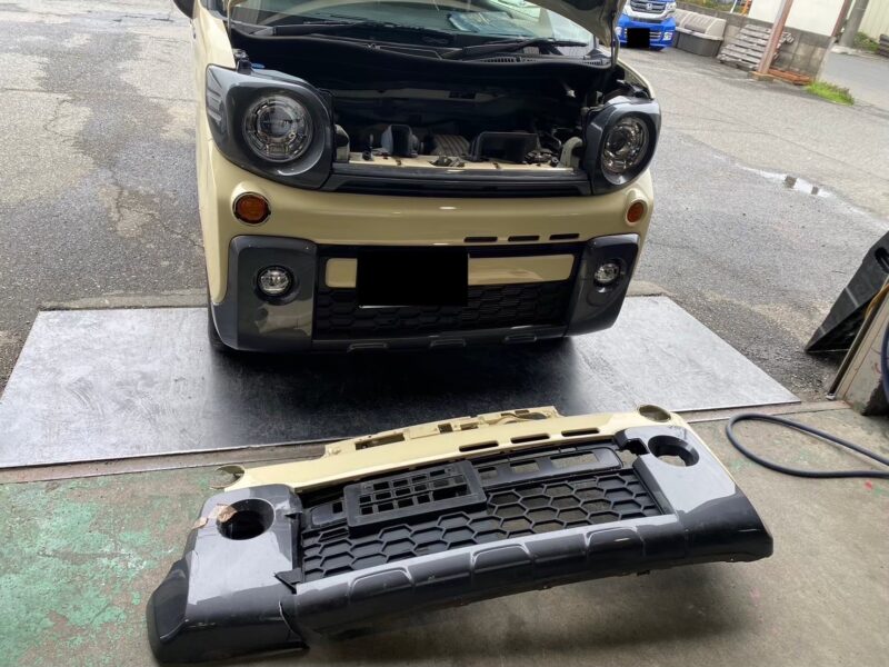 フロントバンパーは損傷が大きかったため一式交換を実施。取り付け後、隣接パネルとの隙間やラインの調整を行い、違和感のない仕上がりにしました。